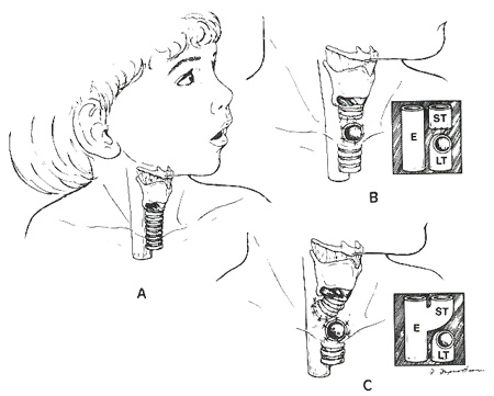 trachea (ST) is closed and the lower trachea (LT) is sutured to the neck skin. The esophagus (E) is left untouched. - C. Laryngeal diversion in which the superior trachea